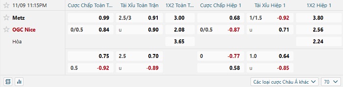 Hiện tại, nhà cái đang niêm yết cho Nice mức chấp -1/4 và khả năng để họ thắng kèo là cực cao. Cần biết rằng trong 7 trận đấu gần nhất của Nice, họ đã thắng kèo đến 5 và chỉ thua 2 trận. Trong khi đó thì Metz đã toàn thua kèo đến 8/10 trận đấu gần đây nhất của mình. Vậy nên các chuyên gia đều khẳng định rằng đội khách Nice sẽ là lựa chọn an toàn nhất trong cả 2 hiệp hôm nay.