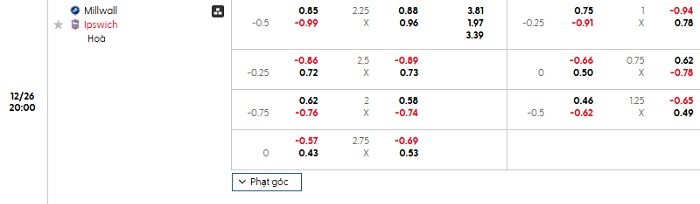 Bảng tỷ lệ kèo bóng đá hôm nay Millwall vs Ipswich