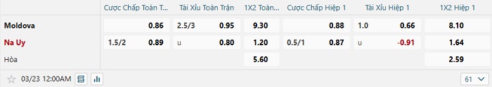 Bảng tỷ lệ kèo bóng đá Moldova vs Na Uy