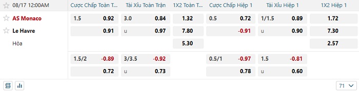 - Kèo tỷ số H1 Monaco vs Le Havre: 1-0