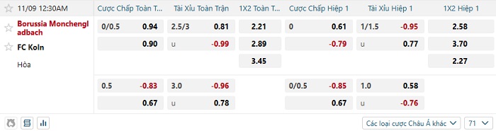Bảng tỷ lệ kèo bóng đá Monchengladbach vs FC Koln