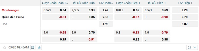 Bảng tỷ lệ kèo bóng đá Montenegro vs Faroe Islands