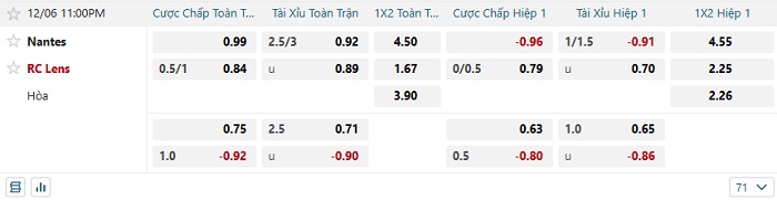 Hiện tại, nhà cái đang đưa ra mức chấp -3/4 dành cho đội khách Lens và họ hoàn toàn tự tin thắng kèo. Trong 8 trận đã qua của Lens, họ chỉ có đúng 1 trận thua và còn lại đều là những kết quả toàn thắng kèo. Ngoài ra thì trong 5 trận gần nhất của Nantes, họ cũng chỉ thắng 1 và thua đến 4 trận theo kèo chấp. Do đó, kèo châu Á trận đấu hôm nay chắc chắn sẽ có đội khách Lens là lựa chọn tối ưu nhất.