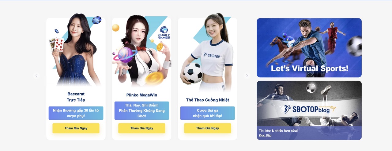 Song hành với sự phát triển chung của thể thao ngoài thực tế thì SBOTOP cũng cho phép người chơi của mình lựa chọn những bộ môn hot như bóng đá, bóng rổ, bóng chuyền, tenis… cùng các giải đấu lớn nhỏ trên toàn thế giới. Bằng việc cung cấp nhiều kèo nhà cái trong một trận đấu cùng tỷ lệ thắng kèo hấp dẫn cho phép người chơi nâng cao hiệu quả cá cược cũng như trực tiếp tìm kiếm lợi nhuận khủng tại nhà cái.