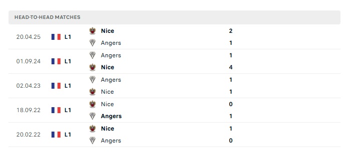 Lịch sử đối đầu Nice vs Angers