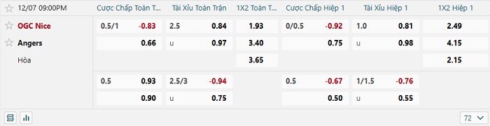 Bảng tỷ lệ kèo bóng đá hôm nay Nice vs Angers