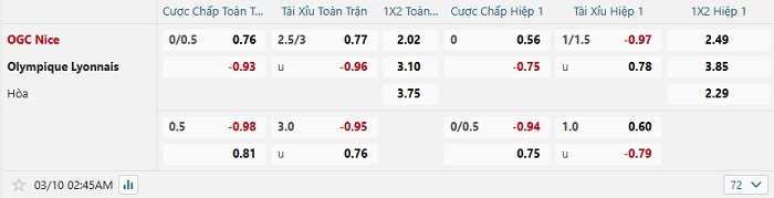 Bảng tỷ lệ kèo bóng đá Nice vs Lyon