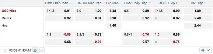 Bảng tỷ lệ kèo nhà cái Nice vs Stade Reims