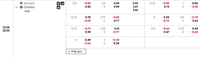 Bảng tỷ lệ kèo bóng đá Norwich vs Charlton Athletic