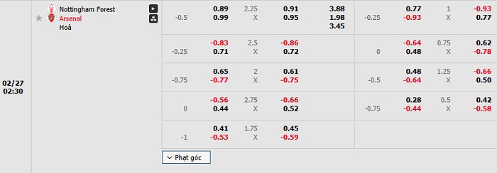 Bảng tỷ lệ kèo bóng đá Nottingham Forest vs Arsenal