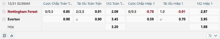 Bảng tỷ lệ kèo nhà cái Nottingham Forest vs Everton