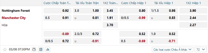 Bảng tỷ lệ kèo bóng đá Nottingham Forest vs Man City