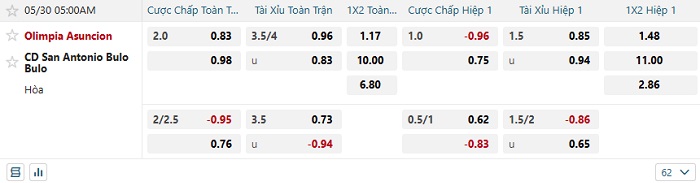 Bảng tỷ lệ kèo nhà cái Olimpia vs San Antonio Bulo Bulo