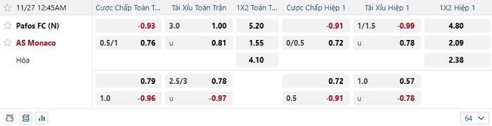 Bảng kèo bóng đá Pafos FC vs Monaco