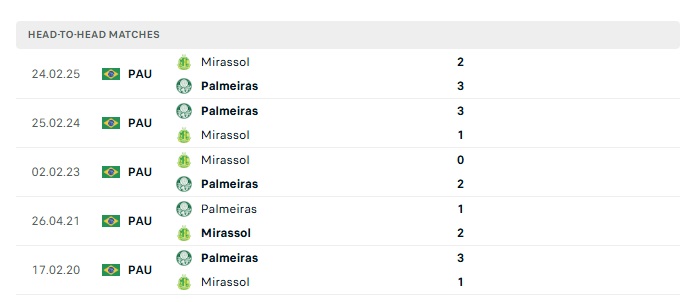 Lịch sử đối đầu Palmeiras vs Mirassol