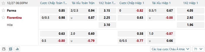 Bảng tỷ lệ kèo nhà cái Parma vs Fiorentina