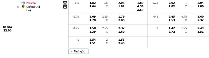 Bảng tỷ lệ kèo bóng đá Preston North End vs Oxford Utd