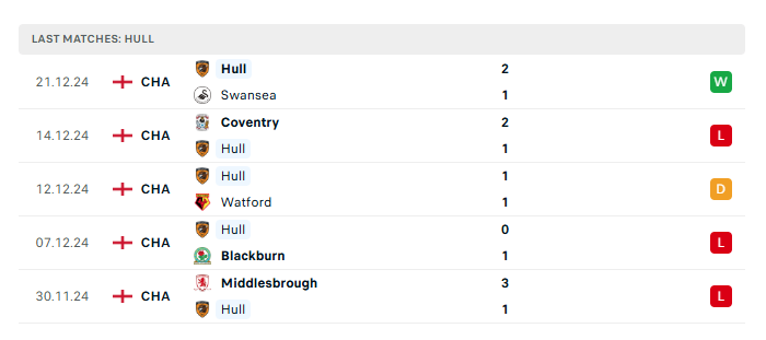 - Phong độ gần đây Hull City