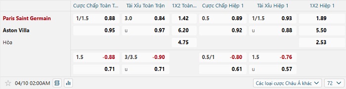 Bảng tỷ lệ kèo nhà cái PSG vs Aston Villa