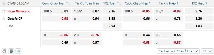 Bảng tỷ lệ kèo bóng đá Rayo Vallecano vs Getafe