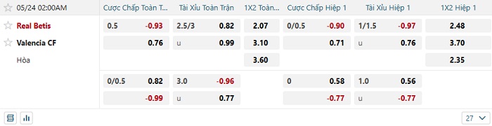 • Kèo tỷ số H2 Real Betis vs Valencia: 0-0