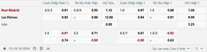 Bảng tỷ lệ kèo bóng đá Real Madrid vs Las Palmas