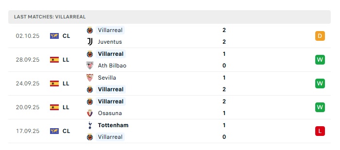 - Phong độ gần đây Villarreal