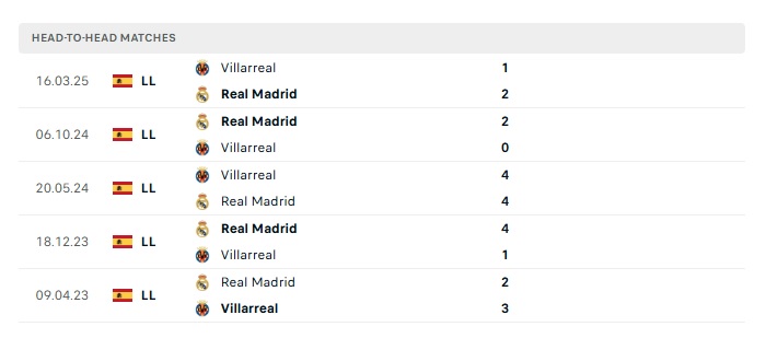 Phong độ gần đây Real Madrid vs Villarreal