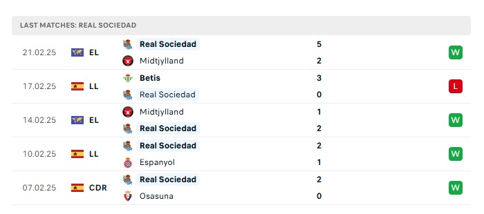 • Phong độ gần đây Real Sociedad