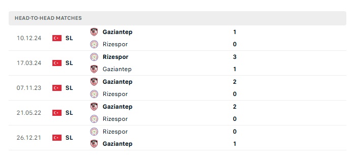 Lịch sử đối đầu Rizespor vs Gaziantep