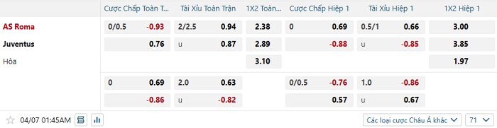 Bảng tỷ lệ kèo nhà cái bóng đá Roma vs Juventus