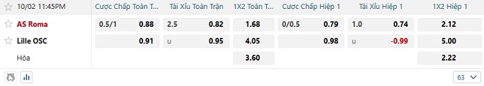 Bảng tỷ lệ kèo bóng đá hôm nay Roma vs Lille