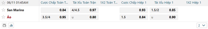 Bảng tỷ lệ kèo nhà cái San Marino vs Áo