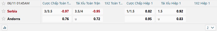 Bảng tỷ lệ kèo bóng đá Serbia vs Andorra