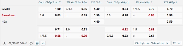 Bảng tỷ lệ kèo bóng đá Sevilla vs Barcelona