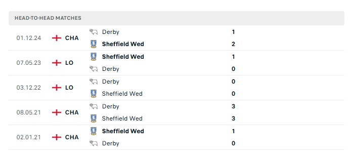 Lịch sử đối đầu Sheffield Wed. vs Derby County