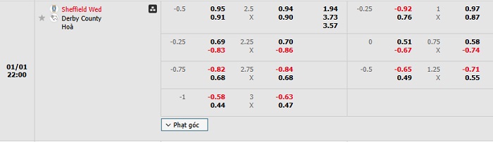 Bảng tỷ lệ kèo bóng đá Sheffield Wed. vs Derby County
