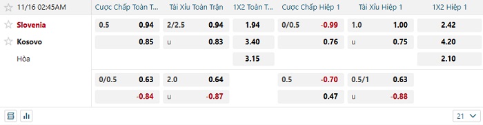 Bảng tỷ lệ kèo nhà cái Slovenia vs Kosovo