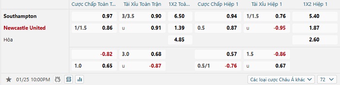 Bảng tỷ lệ kèo bóng đá Southampton vs Newcastle