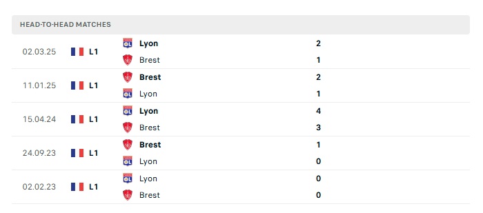 Lịch sử đối đầu Stade Brestois vs Lyon
