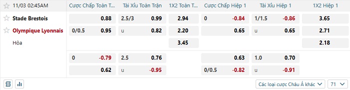 Bảng tỷ lệ kèo nhà cái Stade Brestois vs Lyon