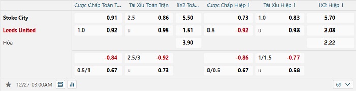 Bảng tỷ lệ kèo bóng đá Stoke City vs Leeds
