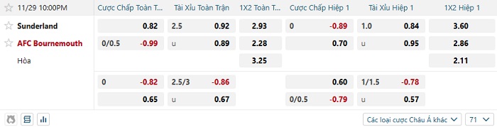 Bảng tỷ lệ kèo nhà cái Sunderland vs Bournemouth