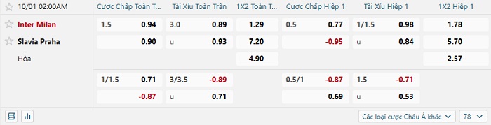 Tip kèo Châu Á hiệp 1 Inter Milan vs Slavia Praha