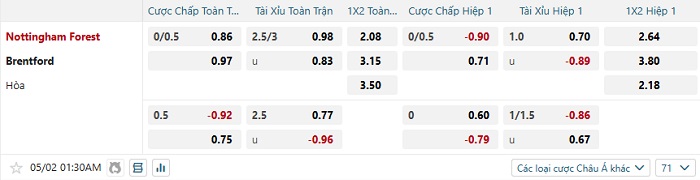 Tip kèo Châu Á hiệp 1 Nottingham vs Brentford