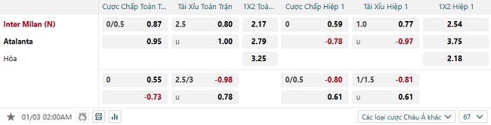 Tip kèo Châu Á hiệp 1 Inter vs Atalanta