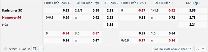 Tip kèo Châu Á full trận Karlsruher vs Hannover