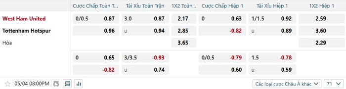 Tip kèo Châu Á hiệp 1 West Ham vs Tottenham