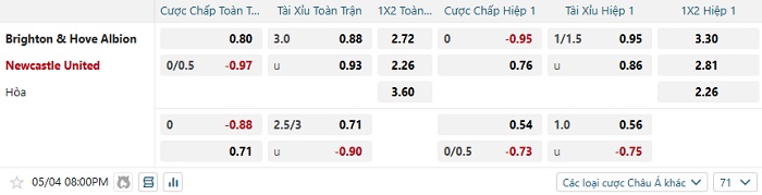 Tip kèo Châu Á hiệp 1 Brighton vs Newcastle