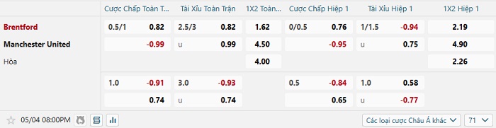 Tip kèo Châu Á hiệp 1 Brentford vs Man United
